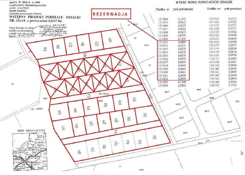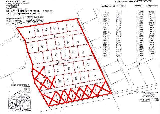 Oferowane działki do sprzedaży oznaczone są numerami od 151/111 do 151/122 o powierzchniach od 670 m2 do 1548 m2.
