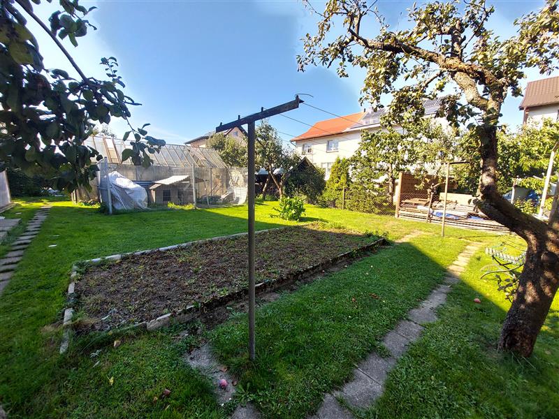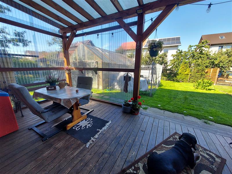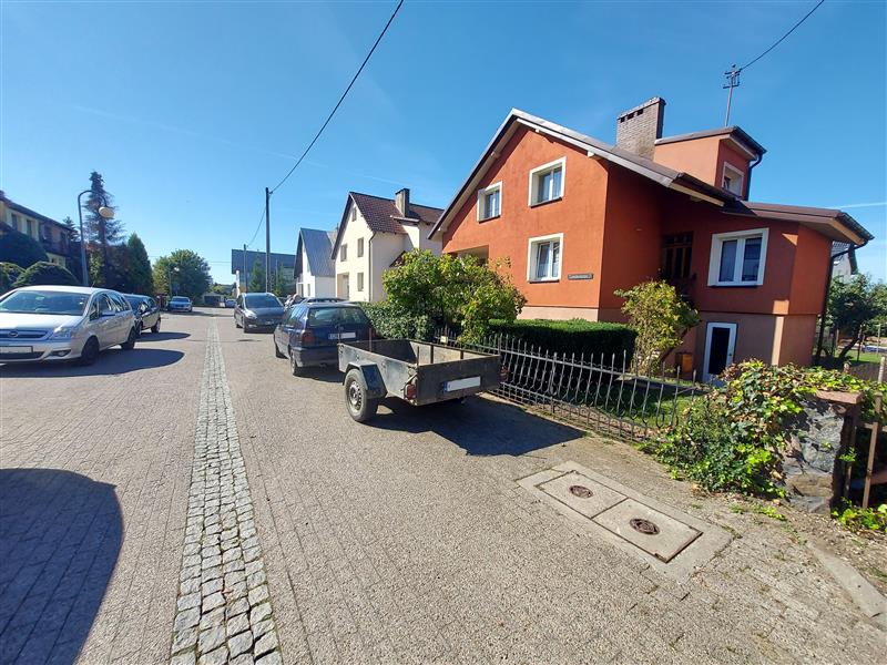 Teren wokół budynku zagospodarowany, znajduje się na nim urządzona zieleń, drzewa owocowe (4 jabłonie, czereśnia, grusza, winogron) zadaszony taras do wypoczynku, murowana wędzarnia, szklarnia, całość ogrodzona. Działka ma kształt prostokąta o szerokości 18 m i długości 29 m. Ulica przy której znajduje się dom to spokojna osiedlowa droga. W bliskim sąsiedztwie znajduje się spory staw, kawałek dalej boiska i szkoła podstawowa.