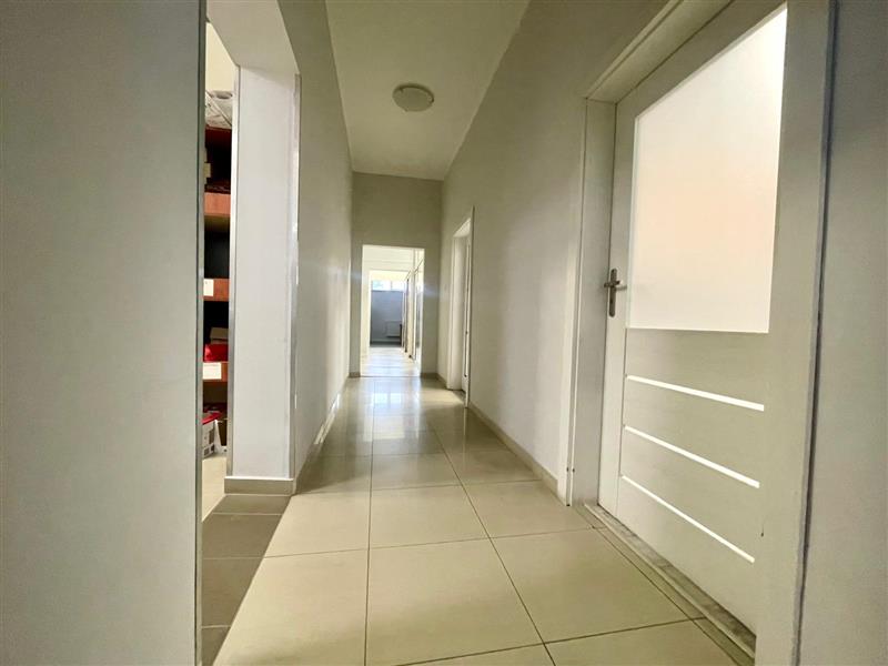 Okna PCV, dach płaski, schody z poręczami, obłożone kafelkami antypoślizgowymi, na podłogach panele podłogowe oraz terakota. Oświetlenie sufitowe rastrowe oraz punktowe.